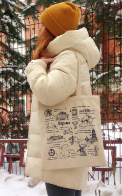 В дизайне сумки использована фраза из романа Владимира Набокова «Bend Sinister». Герой произведения, профессор Круг, уподобляет подъем на лифте в небоскрёбе путешествию сквозь пласты геологических эпох. Лифт несет его «from the twinned night of the Keewenawatin and the horrors of the Laurentian Revolution, through the ghoul-haunted Province of Perm». В русском издании романа С. Ильин перевёл это место как «кишащая упырями провинция Пермь».