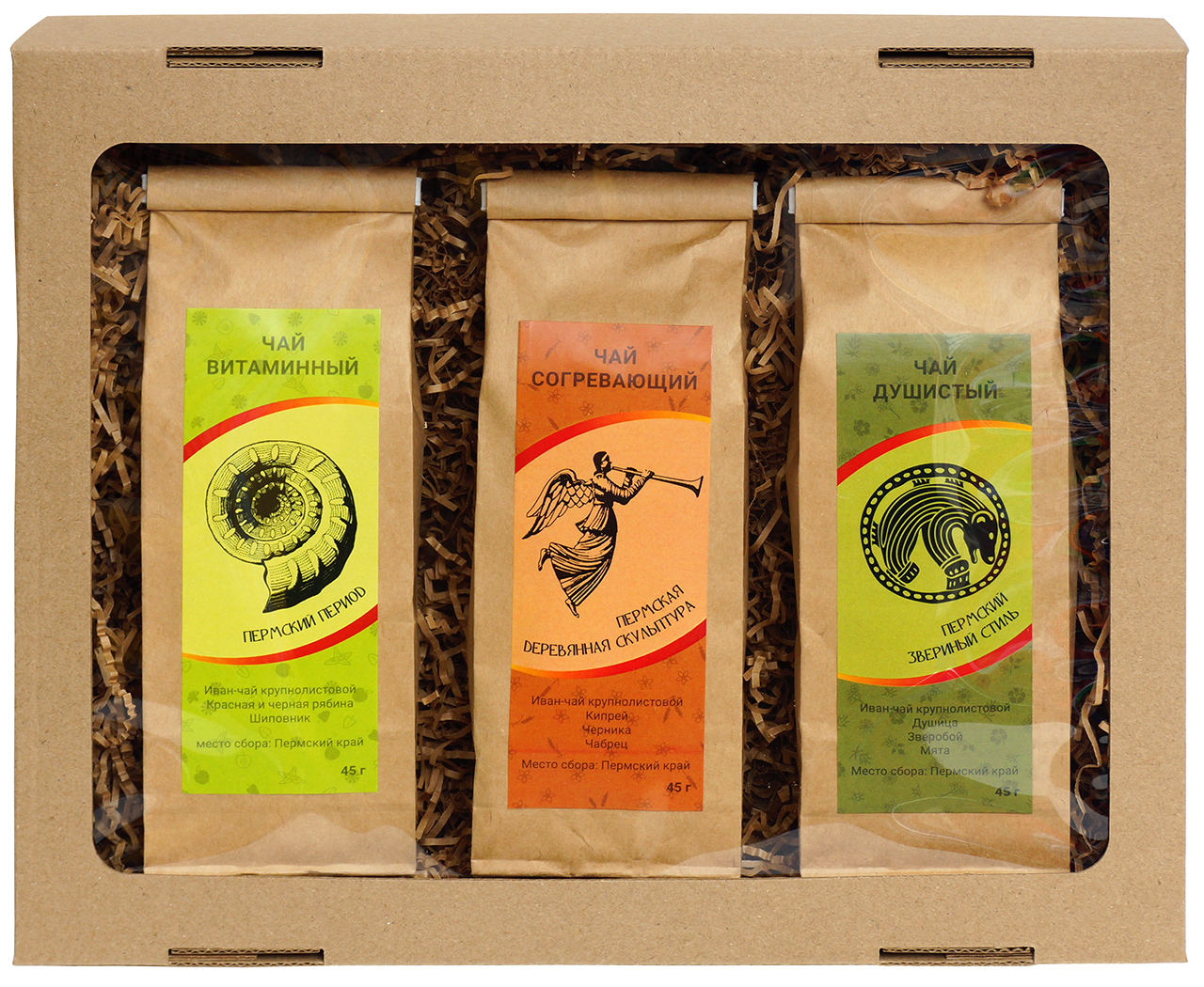 Пакеты фирменного чая носят название знаменитых пермских брендов «Звериного стиля», «Пермской деревянной скульптуры» и «Пермского периода». В наборе изысканный чай на любой вкус – иван-чай с различными добавками